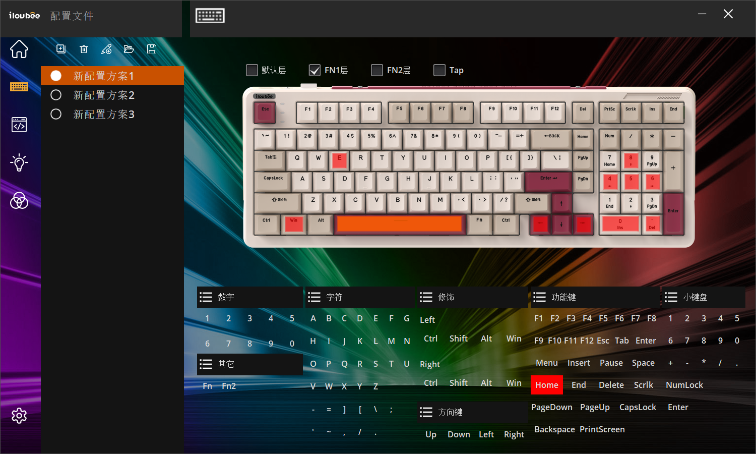 按下Fn,然后再按下其他的键即可触发FN1层的功能,一般机械键盘都可以自定义FN1层的案件功能,比如我就把Fn + ←改成了Home,Fn + →改成了End,以及其他的一些设置,确实便捷了许多